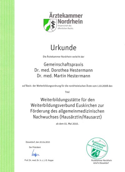 Darüber hinaus ist unsere Praxis ist als Weiterbildungsstätte für den Weiterbildungsverbund Euskirchen zur Förderung des allgemeinmedizinischen Nachwuchses anerkannt. Im Rahmen unserer Verbundweiterbildungsbefugnis bilden wir in Zusammenarbeit mit dem Marien-Hospital Euskirchen Fachärzte/Fachärztinnen für Innere und Allgemeinmedizin (Hausärztin/Hausarzt) aus.